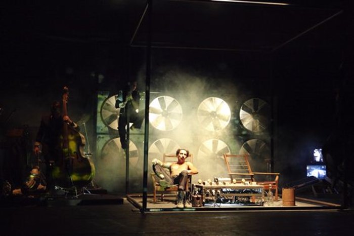 Les numéros de cirque " se diffusent " sur une musique jouée par un homme orchestre : rythme d'une capitale saturée - sièges à ressorts - échafaudage - cube - cadre - machine - son de gare - bruit d'usine - trapèze - musique sauvage mat chinois - bruit de corps - postes trop fort...