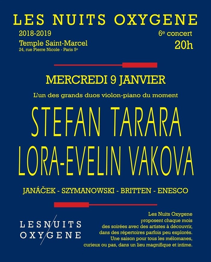 Stefan Tarara et son épouse Lora-Evelin Vakova-Tarara pourront au fil des oeuvres de ce concert parisien se distinguer par leur sens inépuisable des timbres et des atmosphères, comme par leur expressivité intense. Leur programme varie les styles, et les régions d'Europe, de la Moravie (Janácek) à la Roumanie (Enesco) en passant par la Pologne (Szymanowski) et la Grande-Bretagne (Britten). Si vous aimez " les sons et les parfums [qui] tournent dans l'air du soir ", voici votre prochaine grande révélation musicale !