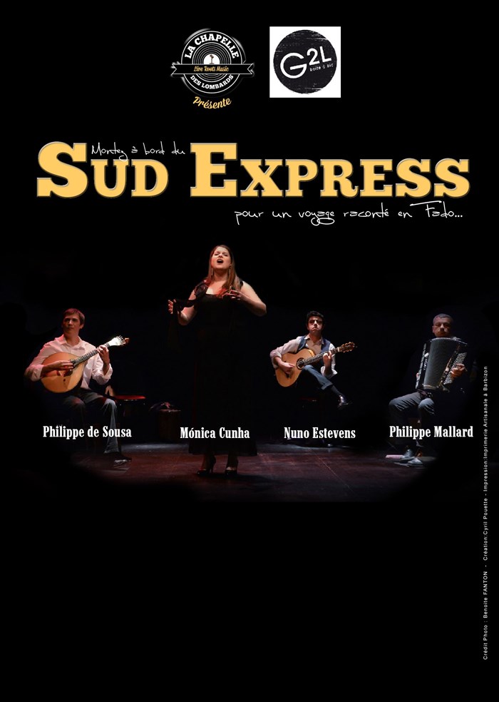 Trois musiciens et une chanteuse vous invitent à prendre place avec eux. Mónica Cunha au chant, Philippe de Sousa à la guitare portugaise, Nuno Estevens à la guitare classique et Philippe Mallard à l'accordéon. Il s'agit d'un spectacle de fado qui ne ressemble ni à un concert ni à une pièce de théâtre, car il prend la forme d'une invitation au voyage du Sud-Express qui vous plonge sans interruption dans les différentes atmosphères, populaires, nostalgiques et parfois burlesques.