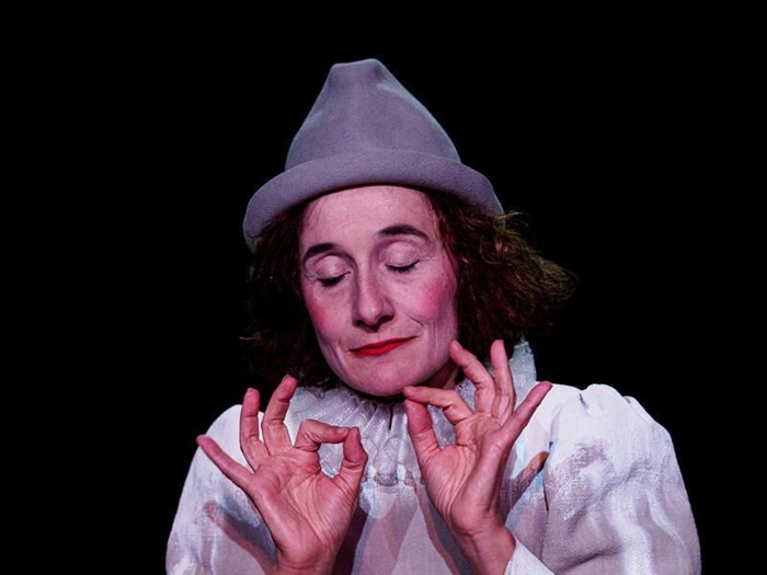 Vêtue du costume du clown blanc, elle commence avec brio par le silence de celle qui se demande ce qu'elle fait là, qui ne veut pas déranger, avant de se demander pourquoi ce serait à elle de faire le spectacle.