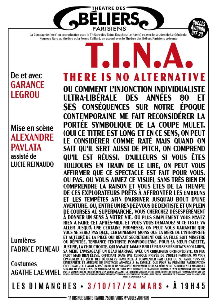 L’événement T.I.N.A : There is no alternative de type Seul(e) en Scène, organisé ici :