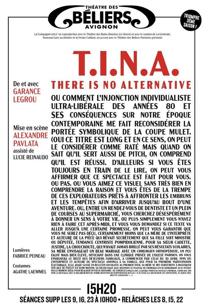 Avec T.I.N.A, le théâtre frappe fort. Un texte percutant, une mise en scène nerveuse et inventive, et une comédienne au diapason d'un sujet brûlant d'actualité. C'est intelligent, engagé, et diablement efficace. Une claque salutaire qui confirme que le théâtre peut encore secouer les consciences. À ne pas manquer."