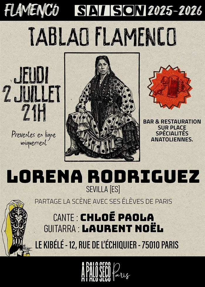 Du mardi 30 Juin au Lundi 6 juillet, la bailaora Lorena Rodriguez sera pour la première fois à Paris pour une semaine de cours collectifs, de cours particuliers et divers ateliers. C'est un véritable honneur pour l'association A Palo Seco de la recevoir, et de vous proposer pour cette occasion deux tablaos en sa compagnie.