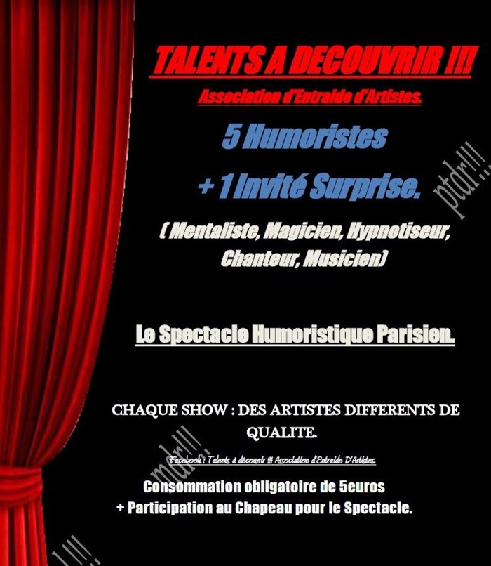 ayant vue talents à découvrir je ne peut que vous le conseiller que vous soyez adepte des huouriste (dans les café) ou pas la vous avez 5+ 1 vrai invité surprise un grand moment de rire, d'interaction avec le publique, de joie et d'émotion.