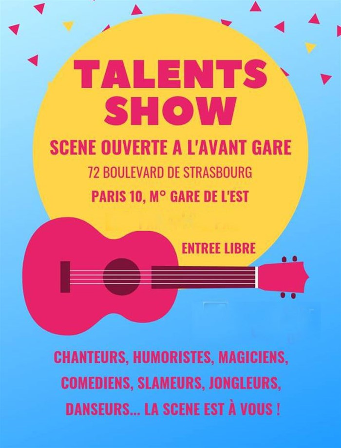 Talents Show propose une scène ouverte à toutes les personnes désireuses d'exprimer leurs talents : chanson, humour, danse, magie, slam, mime, clown... etc le tout dans une ambiance conviviale et chaleureuse.