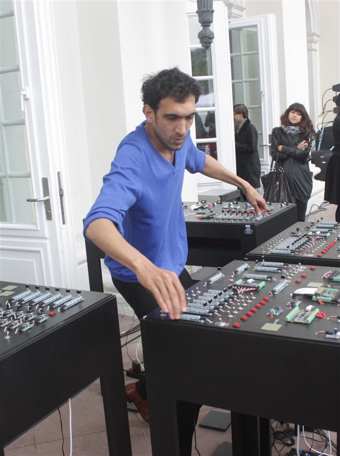 Il joue d'une "table instrumentale" bardée d'instruments et de capteurs électroniques.