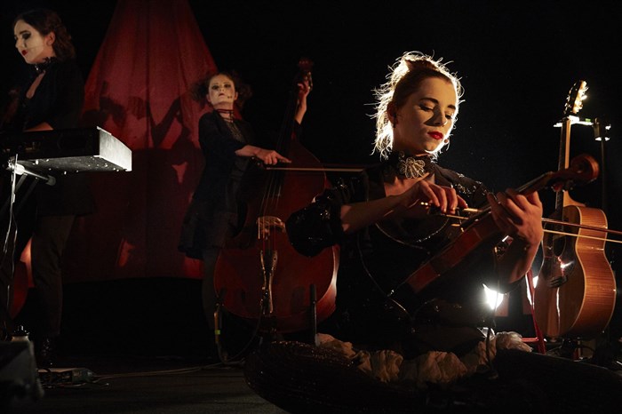 Spectacle de cirque en mode cabaret slave ! Numéros de trampoline, trapèze, magie ou encore mât chinois portés par les balades des Dakh Daughters.