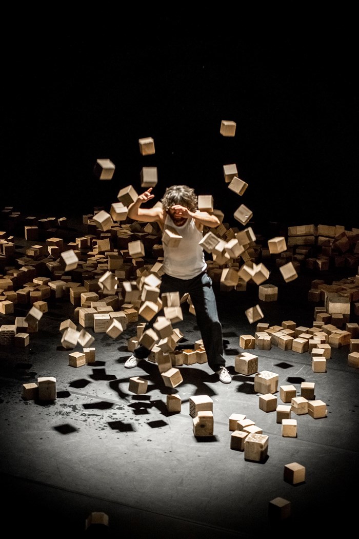 Nacho Flores est équilibriste sur cubes de bois. Pourquoi sur cube ? Parce que le cube est une forme géométrique simple et un moyen commode pour construire des architectures de l'instant, des paysages éphémères, des monuments à forme humaine.