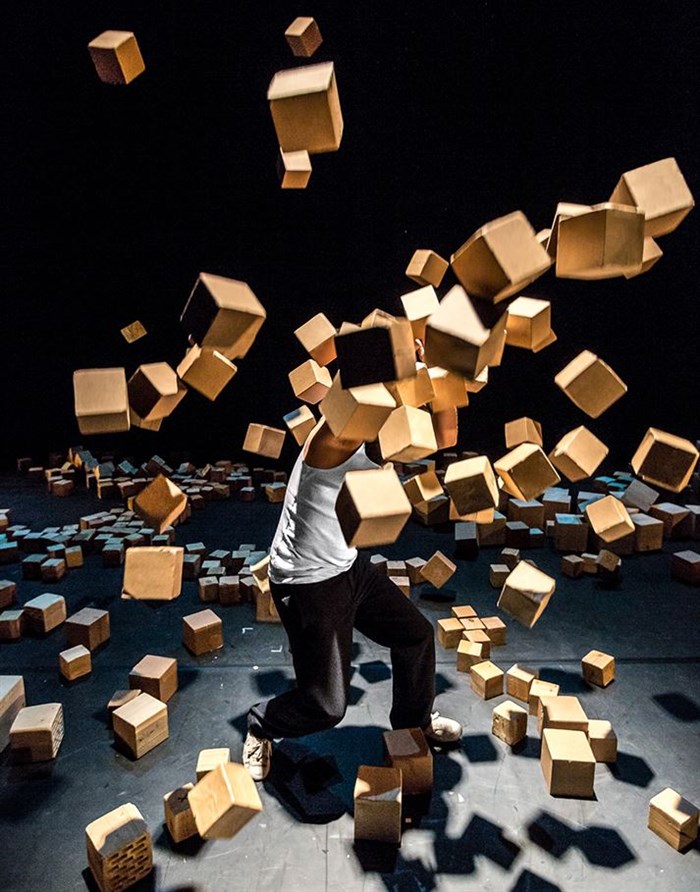 Troublant un peu plus la perception du spectateur, les cubes servent également de support pour des projections vidéo qui permettent à l'artiste de construire un univers saisissant, auquel il ajoute son agilité et son grain de folie. Dans ce décor modulable et instable, le public est littéralement suspendu à ses pas, ébahi par l'audace de cet acrobate.
