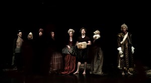 " Sous le regard d'une enfant, une assemblée de dix hommes et femmes réinvente par le mouvement et par la voix les Peintures noires de Francisco Goya. Accrochées à leurs corps, des figures marionnettiques les débordent et les poussent à libérer leur part monstrueuse, troublant notre perception du vivant. Sabbats, exorcismes, processions : ils parcourent les galeries souterraines qui mènent de nos Mardis-Gras au monde des trépassés. Guidés par les forces obscures que traquent les tribunaux d'Inquisition, ils croiseront les destins des minorités qui dérangent, mettant en lumière l'injustice qui de tout temps les accable. Les tableaux, recomposés, se mettent à résonner comme devaient encore retentir, dans la tête de Goya devenu sourd, les cris de suppliciés se mêlant aux rythmes obstinés des seguidillas. "