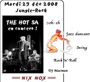 Venez écouter du jazz ou danser le swing avec THE HOT SA , une réincarnation savoureuse de Django Reinhardt et de Louis Prima ! Si si...Ce mardi 23 décembre 2008 à bord du bateau Nix Nox : à 20 h un cours de danse rock et swing puis dance floor à partir de 21h sur la musique délivrée par THE HOT SA ! Débutants ou danseurs aguerris, Venez rocker et swinguer !! Salle climatisée avec une grande piste en parquet de 200 m2, une scÚne pour le groupe, un grand bar, un coin lounge, et une terrasse extérieure...