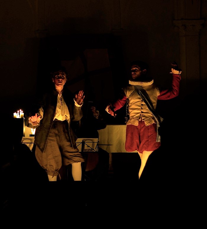 Le spectateur est donc convié à un spectacle total éclairé à la bougie, avec costumes, scénographie, textes déclamés et chantés, et musique, précisément tel que l'on envisageait toujours un spectacle à l'époque élisabéthaine.
