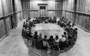 Vous êtes dans le noir complet. Même les vertes issues de secours ont disparu. Vous ne voyez pas vos mains. Vous entendez autour de vous, très près ou très loin, des souffles, des murmures, des cris, des rires, des arias et des chansons, des choeurs, beaucoup de langues, des lambeaux de textes, connus ou pas, une matière poétique et vocale qui vous entoure et vous encercle : vous devenez entièrement écoute, tension sonore. 50 acteurs, 34 langues, 5 continents, et une infinité de possibles, pour faire l'étrange et formidable expérience d'une façon d'être avec les autres.
