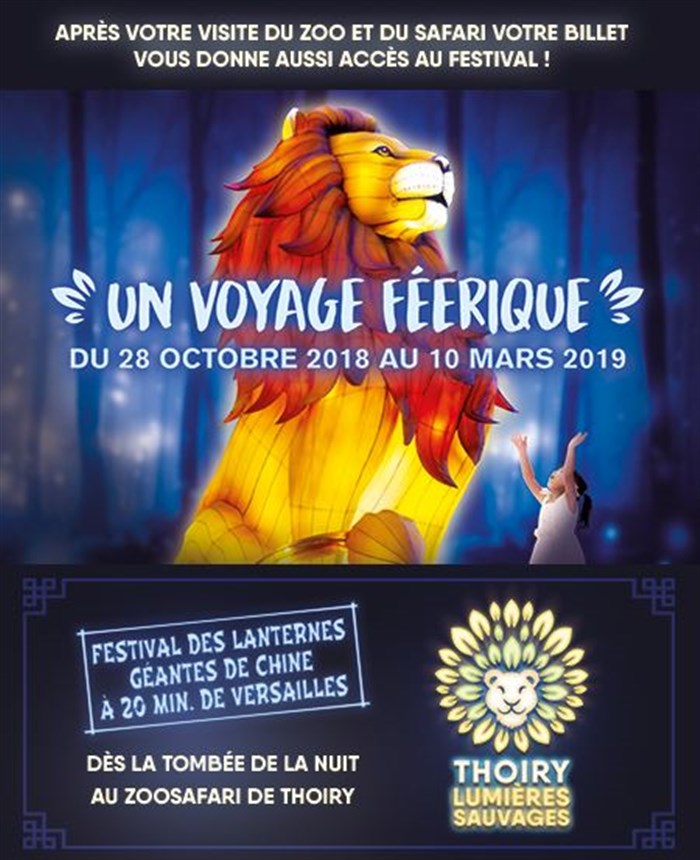 A la tombée de la nuit, venez découvrir les jardins du ZooSafari de Thoiry illuminés de plus de 600 lanternes chinoises géantes, tout droit venues de la culture traditionnelle chinoise et offrez-vous un voyage féérique à la découverte de la Chine, de ses traditions séculaires et d'un monde animalier extraordinaire.