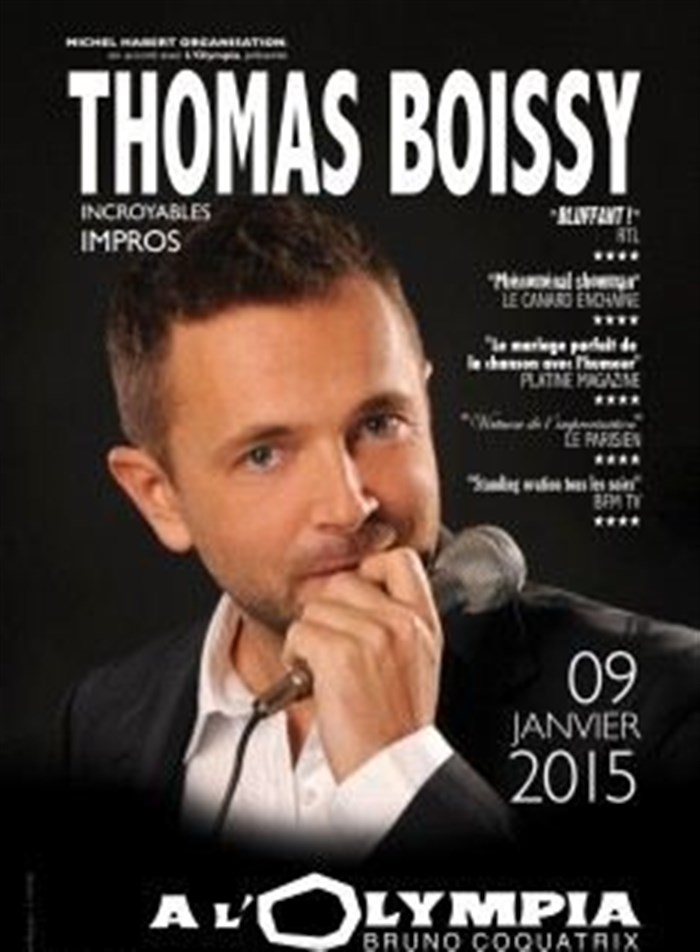 Certainement le spectacle le plus participatif que l'on connaisse ! Thomas Boissy met à contribution le public, et c'est ce qui mobilise toute sa force et son talent. Extrêmement créatif, imaginatif et percutant, en 10 secondes chrono il mettra en musique le moindre de vos fantasmes littéraires et/ou idées saugrenues. Les quatre musiciens qui l'accompagnent, en plus d'être très complices, sont réellement très talentueux et répondent à la moindre improvisation. Mais ce n'est pas tout... Thomas Boissy ce n'est pas seulement un créateur génial, c'est également un chanteur qui donne de la voix ! De Queen à l'Opéra italien en passant par Julio Iglésias, rien ne résiste à ce performer hors norme ! Voir un show de Thomas Boissy, c'est assurément le gage d'une excellente soirée, ou plutôt d'excellentes soirées, car aucun spectacle ne sera identique au précédent ! Thomas est un OVNI qu'il faut absolument voir !