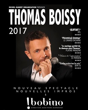 Certainement le spectacle le plus participatif que l'on connaisse ! Thomas Boissy met à contribution le public, et c'est ce qui mobilise toute sa force et son talent. Extrêmement créatif, imaginatif et percutant, en 10 secondes chrono il mettra en musique le moindre de vos fantasmes littéraires et/ou idées saugrenues. Les quatre musiciens qui l'accompagnent, en plus d'être très complices, sont réellement très talentueux et répondent à la moindre improvisation. Mais ce n'est pas tout... Thomas Boissy ce n'est pas seulement un créateur génial, c'est également un chanteur qui donne de la voix ! De Queen à l'Opéra italien en passant par Julio Iglésias, rien ne résiste à ce performer hors norme ! Voir un show de Thomas Boissy, c'est assurément le gage d'une excellente soirée, ou plutôt d'excellentes soirées, car aucun spectacle ne sera identique au précédent ! Thomas est un OVNI qu'il faut absolument voir !