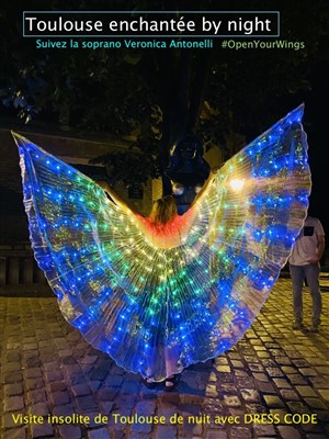 Un rdv culturel original pour les amoureux de la nuit, au dépat de l'Office de tourisme de Toulouse, conviés à rejoindre la soprano costumée de ses ailes de lumière, dans un parcours inédit "by night" de Toulouse.