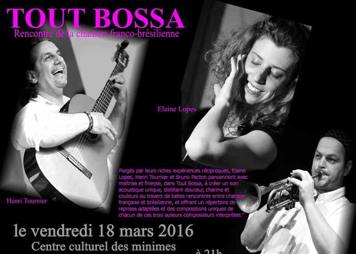 Forgés par leurs riches expériences réciproques, Elaine Lopes, Henri Tournier et Bruno Pacton parviennent avec maîtrise et finesse, dans Tout Bossa, à créer un son acoustique unique, distillant douceur, charme et couleurs au travers de belles rencontres entre chanson française et brésilienne, et offrant un répertoire de reprises adaptées et des compositions uniques de chacun de ces trois auteurs compositeurs interprètes."