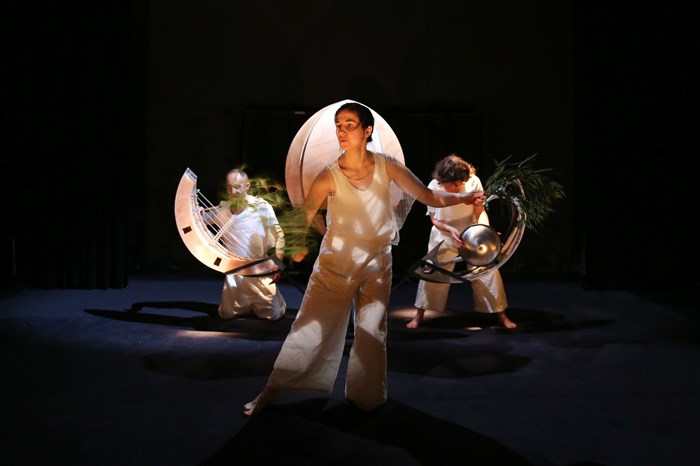 Trois acteurs vêtus de blanc ressemblant à de lointaines divinités créent le coeur des hommes, le siège de leurs émotions. Jouant et chantant, ils nous offrent un incroyable voyage hypersensible.