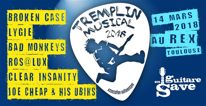 Les trois premiers auront l'occasion de se produire en concert, sur la grande scène du festival Guitarensave, en première partie, du 26 Mai au 2 Juin 2018. Venez nombreux soutenir vos groupes favoris, et découvrir : Broken Case, Bad Monkeys, Clear Insanity, Joe Cheap & His Ubiks Lygie, Rosa2Lux.