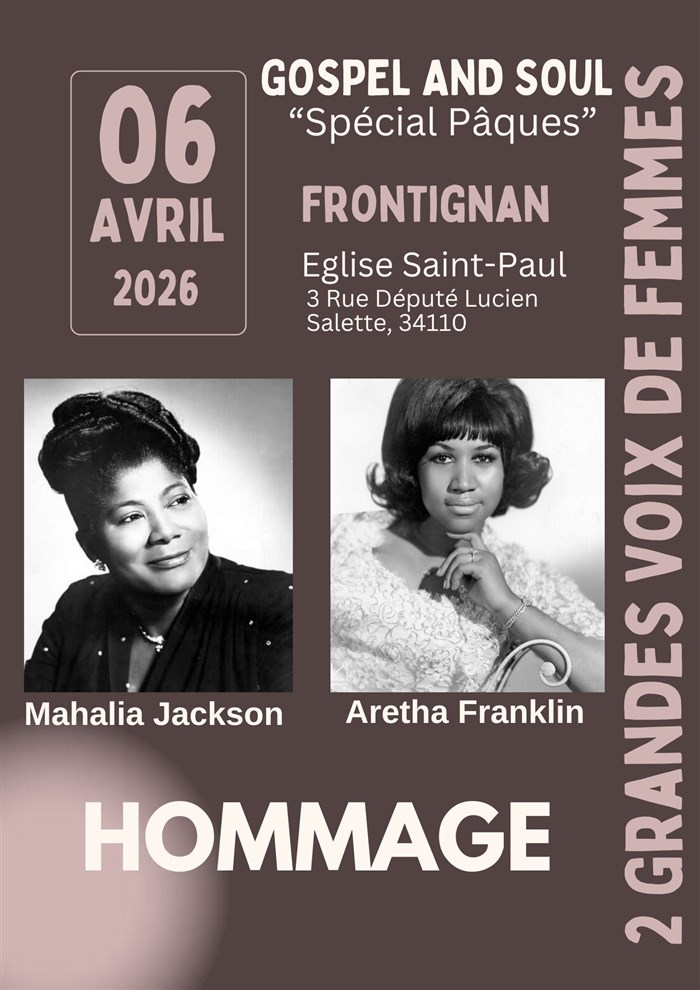 Découvre Tribute Mahalia Jackson & Aretha Franklin | Spécial Pâques, qui fait partie de notre sélection d’événements de type Concerts et qui se tient ici : Église Saint-Paul de Frontignan -