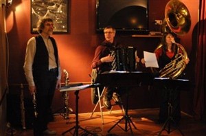 Ces trois musiciens découvrent rapidement leur goût commun pour les musiques intenses, chaleureuses et nostalgiques très présentes dans le répertoire populaire. Hora, bulgar, freylakh, valse, tango, choro... des danses d' Est en Ouest qu'ils revisitent à leur envie. Tels des nomades cheminant sur leurs instruments, ils auront plaisir à partager avec vous leur voyage bohème, vivant et festif.