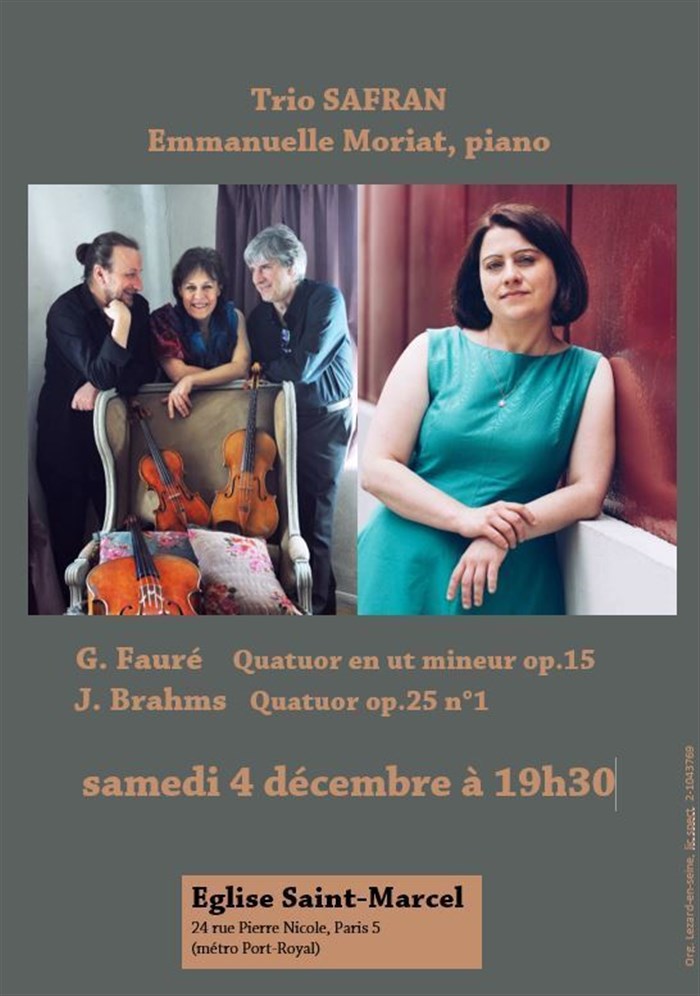 Le Trio Safran (Pascal Robault, Véronique Marin et Nicolas Miribel) et Emmanuelle Moriat (piano) interprètent les quatuors de Fauré et de Brahms.
