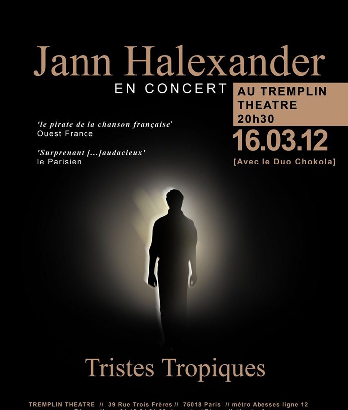 Des milliers de disques et dvd vendus, une centaine de concerts donnés en France, Belgique, Allemagne, Jann Halexander, artiste touche-à-tout donne, à l'occasion de la sortie de son nouvel album, 'Tristes Tropiques', un récital entre joie, humour, passion et mélancolie, accompagné par le Duo de choristes Chokola et d'autres artistes.