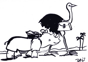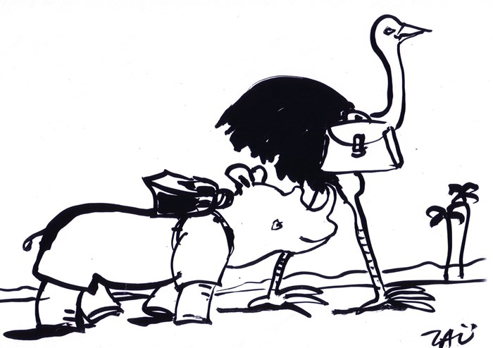 Sous le pinceau de Zaü, l'histoire racontée et illustrée, du rhinocéros Rino et de l'autruche Trucha, nouveaux élèves dans l'école...