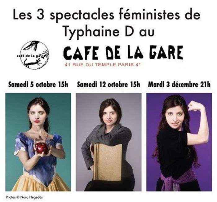 Typhaine D autrice, comédienne, metteuse en scène, formatrice, coach, conférencière engagée pour les Droits des Femmes et des Enfants, présente trois spectacles au Café de la Gare pour trois représentations exceptionnelles.