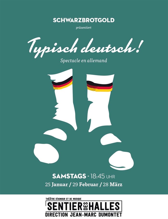 Das Erfolgsstück von Schwarzbrotgold, dem kreativen und ältesten deutschsprachigen Theaterkollektiv von Paris. Ein Abend voller Überraschungen rund um die Frage: Was ist nun eigentlich typisch deutsch? Schauspieler und Publikum schmieden gemeinsam Antworten aus unkaputtbaren Vorurteilen, feinsten Stereotypen und der bitteren Wahrheit. Die Socken in Ihren Sandalen werden die 2 Seelen wärmen, die, ach, in Ihrer Brust wohnen.