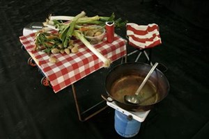 Elle vient nous préparer - en direct ! - une soupe ... une vraie ! avec de vrais lègumes ! car elle pense que les spectateurs sont des réfugiés et qu'ils ont faim.