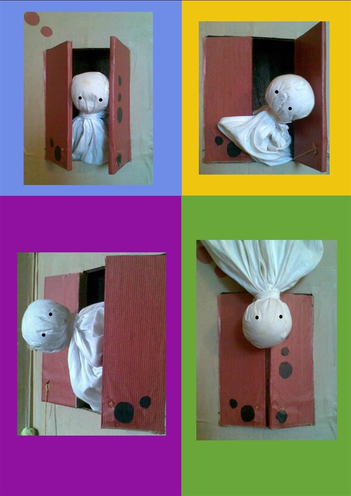 Papotine construit les personnages de l'histoire qu'elle raconte avec des bouts d'chiffons qu'elle sort des cases et qu'elle transforme en marionnettes en les plongeant dans les boîtes.