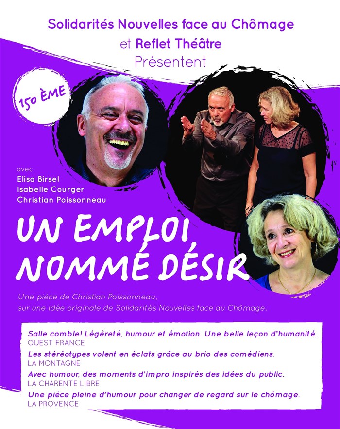 Après Tout Pour Être Heureux, présenté en mars 2017, Christian Poissonneau et Isabelle Courger montent de nouveau sur la scène de l'Azile avec un autre projet, " Un Emploi Nommé Désir ". Créée sur mesure à partir de témoignages de terrain, la pièce met en scène de manière humoristique les réalités auxquelles sont confrontés les chercheurs-euses d'emploi : préjugés, pertes de repères, isolement social, etc.