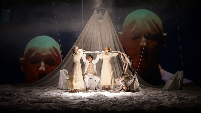 Un Jour est un spectacle de fantômes parce que les fantômes, comme les morts, existent et n'existent pas. Un jour est une histoire de revenants qui reviennent à leur façon hanter les vivants, c'est-à-dire au fond revivre avec eux.