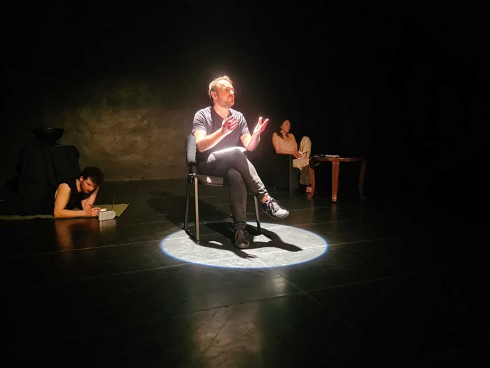 Trois voix résonnent dans un espace où tout vacille: un homme en quête de sens, une femme enfermée dans une absence, un reflet qui provoque.