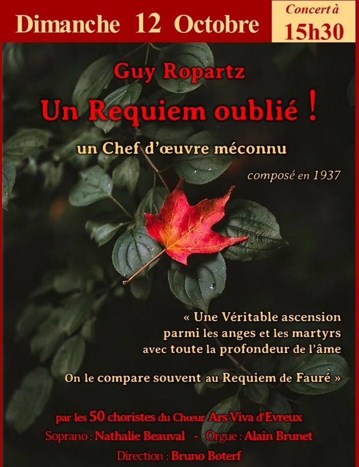 Je ne connaissais pas ce réquiem oublié de Guy Ropartz interprété avec maestria par les 50 choristes du coeur Ars Viva d'Evreux - sublime et émouvant !