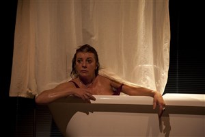 Une femme enfermée dans sa salle de bain discute avec elle-même pour dépasser le bruit de la télé, seule compagne de sa solitude.