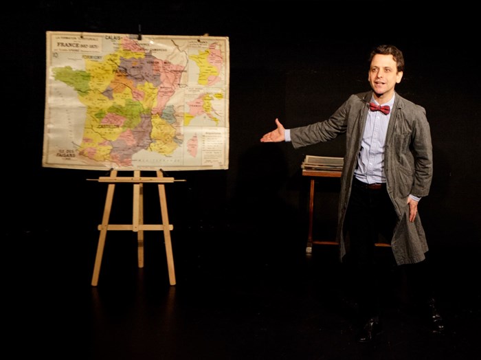 Pour faire vivre sur scène cette épopée, qui tient plus du grand récit mythologique que du cours d'histoire scientifique, je me suis amusé à tenir le rôle de l'instituteur d'autrefois, avec sa blouse grise et sa grande carte de France, comme on en voyait jadis dans toutes les salles de classe. Maxime d'Aboville