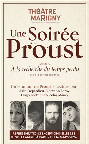 Découvre Une soirée avec Proust, qui fait partie de notre sélection d’événements de type Lecture / Poésie / Contes et qui se tient ici : Théâtre Marigny -