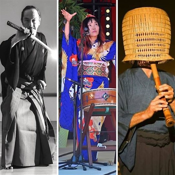 C'est par la maîtrise du relâchement et du souffle, que jaillissent les sons du tambour Taiko, de la flûte Shakuhachi, les enchaînements du sabre Katana (iaido) et du No. Paradoxe de légèreté ancrée et de mouvement dans l'immobilisme, sons évocateurs et gestuelle qui suscitent intériorité et partage de l'instant, créant une oeuvre éphémère qui nous touche au plus profond, éveillant le sourire de la sérénité ...