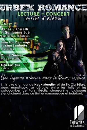 Création totale! Paris vu par les extrêmes (les toits et les catacombes) sur fond de street art! Un suspense haletant dans une pénombre électrique... Les musiciens (violon et guitare électriques) sont inspirés et virtuoses et accompagnent les deux héros (Neck Mergitur et Zig Zig Zébra) dans leur fuite sur les toits de Paris...Du théâtre musical absolument étonnant, original avec un regard aigu sur le Paris d'aujourd'hui...A voir et à écouter absolument...