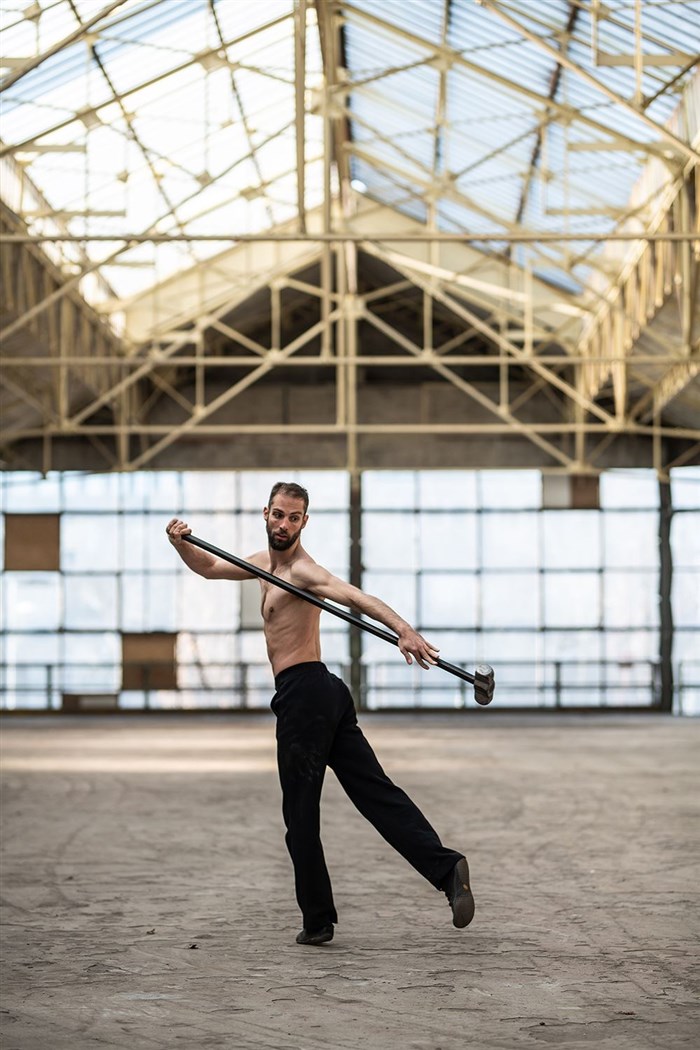 Alexander Vantournhout choisit de se colleter à la figure de Thor, le dieu scandinave du tonnerre, muni de Mjölnir, son marteau au manche court.