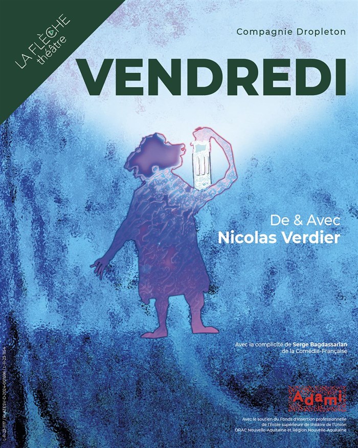 Vendredi, naufragé solitaire, a recréé un monde. Face au public, il tente de tisser un lien fragile.