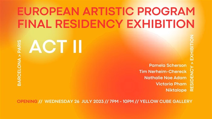 Dans le cadre du Programme Artistique Européen en collaboration avec les résidences artistiques R.A.R.O Barcelone et l'Open Bach Paris, la Yellow Cube Gallery est ravie de vous accueillir tout l'été pour vous présenter les créations de 5 artistes contemporains réunis autour d'un projet haut en couleur.