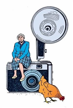 Chez elle, ça sent l'eau de Cologne et la poussière. Dans sa robe couleur d'automne, vieux tweed à carreaux clairs, Mère Hollunder est ronde, bonhomme. Autour d'elle, des poules, un magnétophone. À son cou, en bandoulière, un appareil photo.