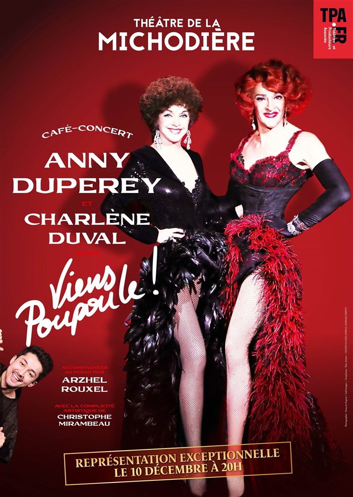 Le 10 décembre, lors d'une représentation exceptionnelle, laissez-vous séduire par ce "Viens Poupoule !" et ses chansons audacieuses et pleines d'humour interprétées par Anny Duperey et Charlène Duval, accompagnées au piano par Arzhel Rouxel. Une soirée inattendue qui vous plongera dans l'ambiance des cafés-concerts de la Belle Époque !