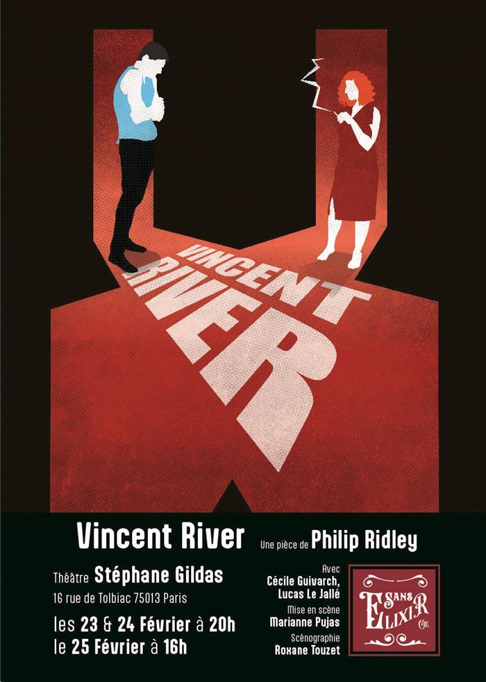 Vincent River est un drame contemporain de Philip Ridley qui met en scène deux êtres écorchés que rien ne destinait à se rencontrer. Cette très belle pièce invite à la compassion et à la tolérance. Son écriture est puissante. Elle secoue et fascine. La compagnie SansElixir a été séduite par l'aspect cinématographique de la pièce, écrite à la manière d'un thriller psychologique.