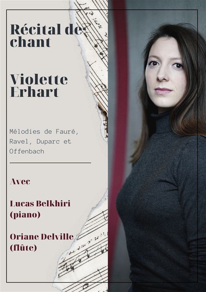Dans son premier récital de mezzo soprano, Violette Erhart, comédienne de formation, explore dans une première partie onirique les mélodies du vingtième siècle de Duparc, Fauré, ou encore Ravel... Dans un second temps, après cette douce contemplation, vous voyagerez cette fois-ci dans l'univers léger et pétillant de l'opérette, avec Jacques Offenbach et ses emblématiques personnages comme Hélène, la duchesse de Gerolstein, ou encore la Fille du Tambour Major.