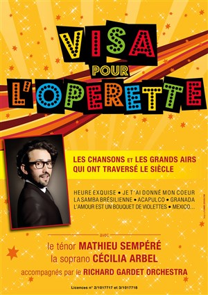Mathieu Sempere déjà connu par le public pour ses différentes interprétations remarquées (notamment avec le groupe Les Stentors) et Cécilia Arbel vous invitent à découvrir le spectacle : Visa pour l'opérette, accompagné par l'orchestre de Richard Gardet.